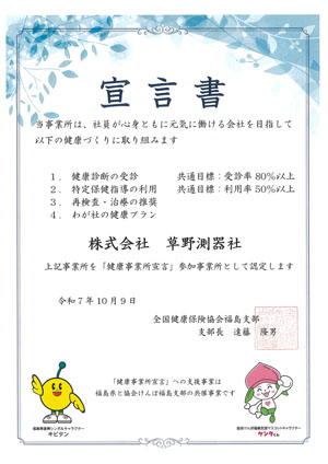 弊社では従業員一人ひとりが心も身体も元気に働くことができる職場を目指して、日々健康づくりを進めて参ります〜健康事業所宣言とは〜福島県と協会けんぽ福島支部が連携...